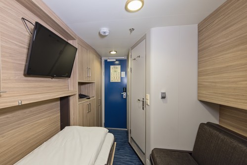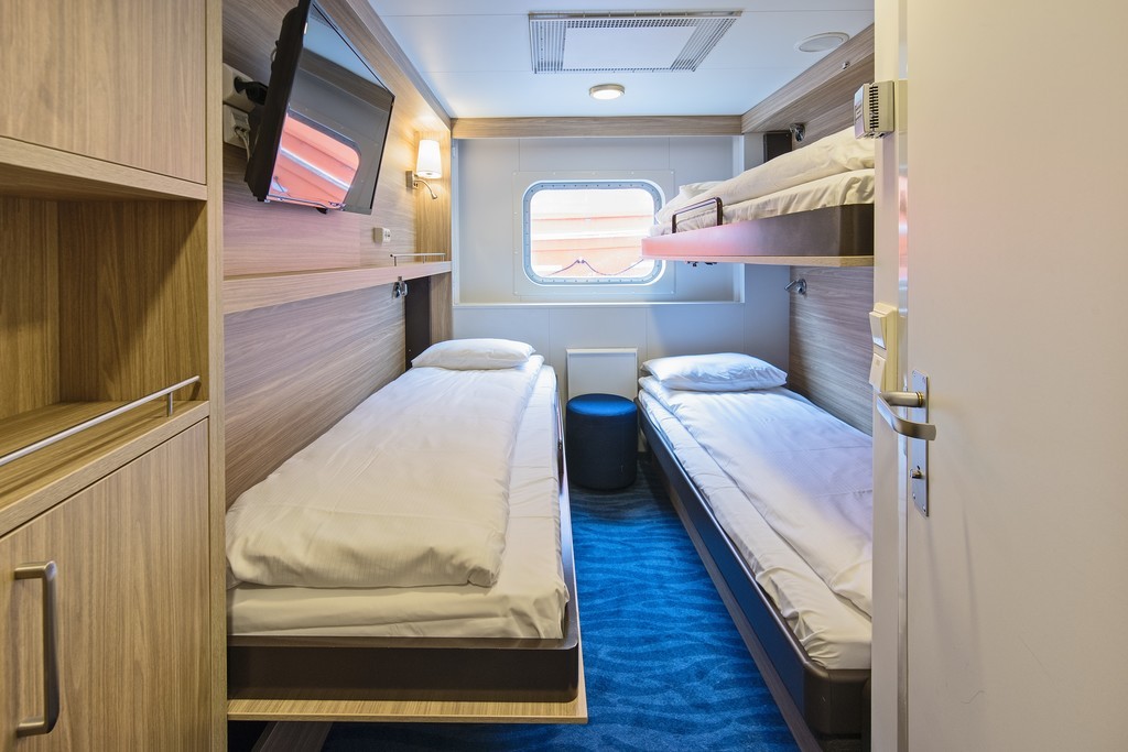 These comfortable refurbished cabins for up to three people on the middle decks have single beds, bunk beds, TV, and a hairdryer.