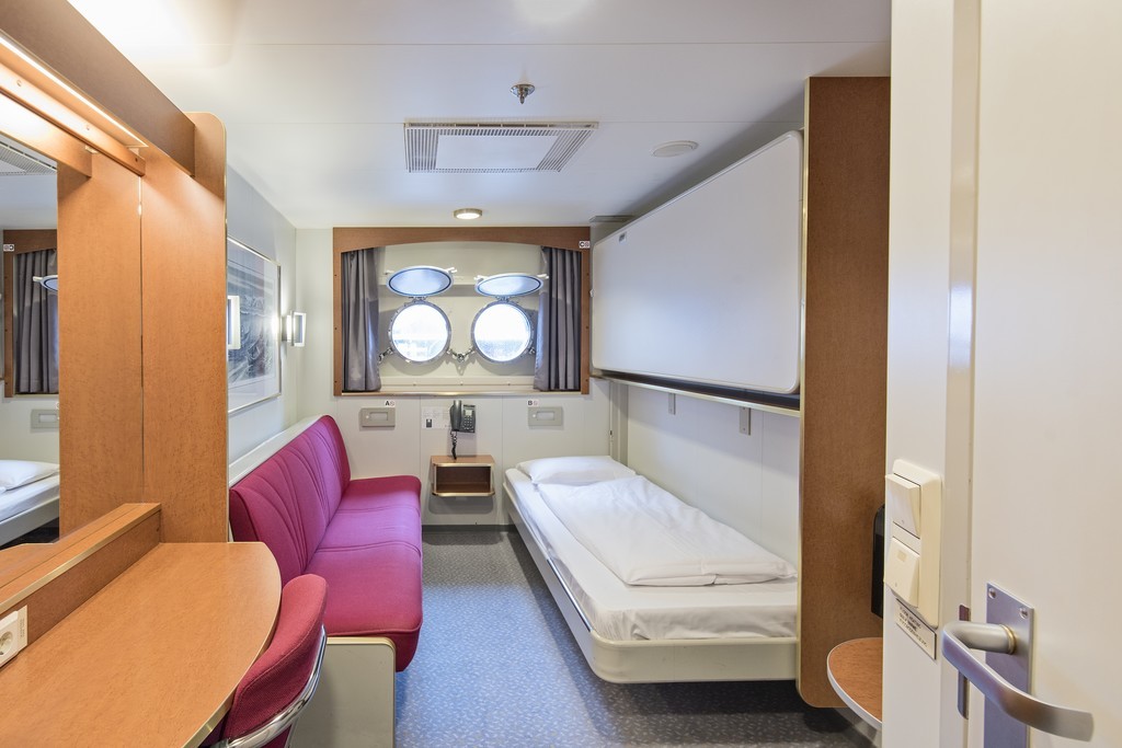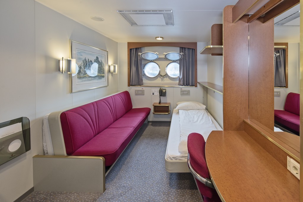 Our Polar outside cabins are situated mostly on middle or lower deck and all have bathrooms with shower/WC. These comfortable, refurbished outside cabins for up to three people on the upper decks have single beds, one of which converts into a sofa, bunk beds, TV, and a hairdryer. The cabins have limited or no view.